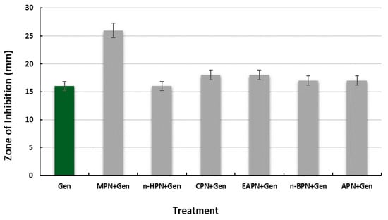 In the case of S. typhi, the zone of inhibition of gentamicin (Gen) was 16 mm (Figure 10), whereas the inhibition zone of S. typhi recorded according to the CLSI standard is ≥15 mm (Table 2). By using P. nigrum extracts along with Gen, the zone of inhibition increased to a maximum of 26 mm with MPN, which was very significant. CPN and EAPN extracts, when supplemented with gentamicin, increased the zones of inhibition to about 18 mm, whereas the remaining extracts, n-HPN, n-BPN, and APN in combination with gentamycin, increased the inhibition zones to between 17 and 18 mm.