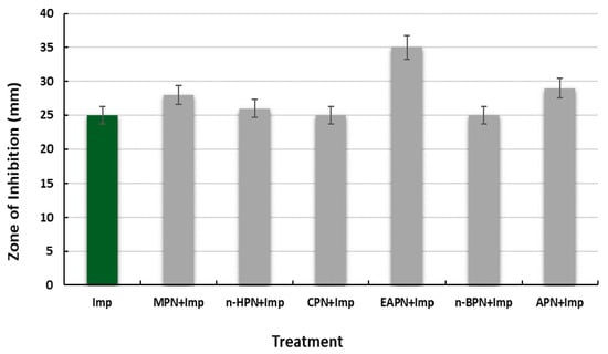 In the case of S. typhi, the zone of inhibition of imipenem (Imp) was 25 mm (Figure 14), whereas the inhibition zone of S. typhi is ≥23 mm for imipenem according to CLSI standards (Table 2). EAPN extract with Imp showed the maximum zone of inhibition (35 mm), which was significant because the value falls within the sensitive zone. The APN zone of inhibition was increased to about 29 mm while the MPN and n-BPL zones of inhibition were increased to about 28 mm. The remaining extracts’, viz., n-HPN, CPN, and n-BPN, zones of inhibition were increased only to between 25 and26 mm.