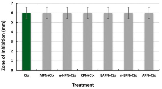 The inhibition zone of S. typhi, according to CLSI is ≥26 mm for cefotaxime (Table 2). In the case of S. typhi, the zone of inhibition of cefotaxime (Ctx) was 6 mm (Figure 15). Using extracts of P. nigrum supplemented with cefotaxime, MPN, n-HPN, CPN, EAPN, n-BPN, and APN did not show any increase in the zone of inhibition for S. typhi.