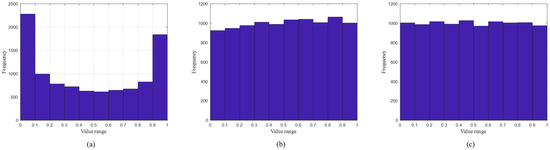 Distribution histogram of three chaotic mappings: (a) distribution histogram of Logistic mapping; (b) distribution histogram of Tent mapping; (c) distribution histogram of Bernoulli mapping.