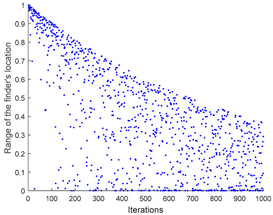 where x means the current number of evolutions, T is an upper evolutionary threshold set by the algorithm, and y is the variation range of the finder’s location. When T is 1000, the image of Equation (6) is shown in Figure 2.