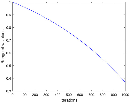 where w is an adaptive inertia weight, its value will gradually decrease along with t increases. Figure 3 indicates its image features. One knows that its value is relatively large in the early stage of the iteration of w, i.e., the initial algorithm will perform a large-scale search. When the t in the algorithm changes by adding 1, the value of w gradually decreases, strengthening SSA’s partial performance in the later stage of evolution, such as convergent accuracy.