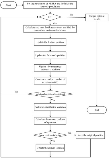 The above three strategies are introduced to improve the sparrow search algorithm so that the diversity of the population of SSA is improved, and the search method is improved to optimize the performance. The experimental results are presented in Section 5. Figure 4 is the flowsheet of the MISSA proposed in this paper, and the implementation procedure of MISSA is illustrated in Algorithm 1.