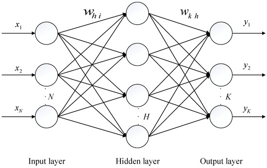 The BP neural network is a multi-layer network developed from MLP, with forwarding propagation of inputs and backward propagation of obtained errors. Owing to BP neural network’s low computational cost and strong generalization ability, it has been favored by many scholars [35]. The BP neural network comprises three layers: the input layer, the output layer, and the hidden layer. The number of nodes in each layer is designed according to the actual problem, and its brief structure is shown in Figure 5. It follows that the output of the network is calculated as follows: