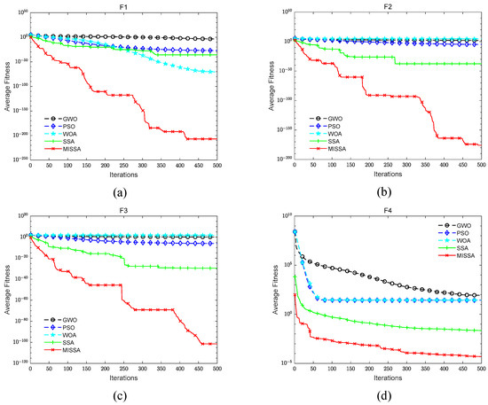 From Table 2, we know that in the solution of unimodal functions F1, F2 and F3, MISSA is the only one that can obtain the optimal solution, and the standard deviation of the F1 and F2 functions is also 0. When solving the function F1, only MISSA and SSA reach the optimal solution. Regarding the solution of unimodal functions F4 and F5, the average value and standard deviation of MISSA are obviously improved compared with other algorithms. MISSA is the best among the five algorithms for solving unimodal functions. In the last five multimodal functions, for the solution of F6 and F7, the accuracy and stability of MISSA and SSA are the same as the results. Still, in the resolution of F8, F9, and F10, the three indicators of MISSA are the best among the comparison algorithms.