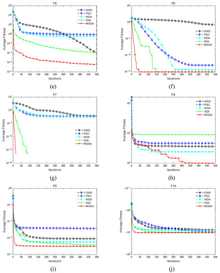 To directly see the changes in the convergent speed and accuracy of various algorithms, the average fitness convergence of the five algorithms when solving ten benchmark functions is plotted. Figure 7 distinctly displays that when the optimization test is performed for ten benchmark functions, MISSA can achieve the desired effect relatively quickly and perform well.