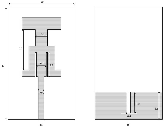 Structure diagram of planar tri-band antenna: (a) front structure of the antenna; (b) reverse structure of the antenna.