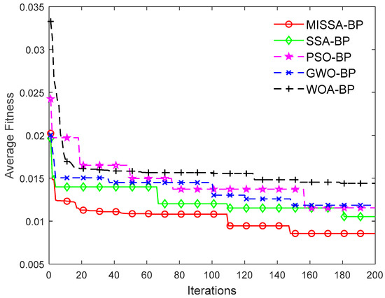Each optimized surrogate model performs ten independent predictions on the test set, and Table 4 shows the average accuracy of prediction and time-consuming. The average training fitness iteration curves of PSO-BP, GWO-BP, WOA-BP, SSA-BP, and MISSA-BP surrogate models are shown in Figure 10.