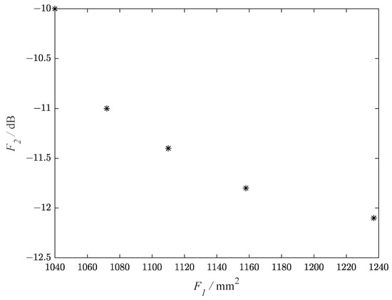 In the equation, a design variable is a group of determined vectors. It represents m structural sizes of the antenna that need to be processed in this paper. X is the space of parameters that is decided by the boundary of the structural parameters of the antenna. are n objective functions to be optimized. The main objective of antenna design is to reduce the reflection coefficient of a specific frequency band. Still, other indicators of the antenna have high demands in many cases. The different indicators will have clashed, making it difficult to reach the optimal solution simultaneously. At this time, we demand an answer in the middle to solve the problem, which is called the non-dominated solution set. All solutions in the non-dominated solution set constitute the Pareto front (PF) [32]. In this paper, PF is the solution we need to get. PF represents the intermediate answer to the multi-objective antenna, and we can design the antenna according to it.