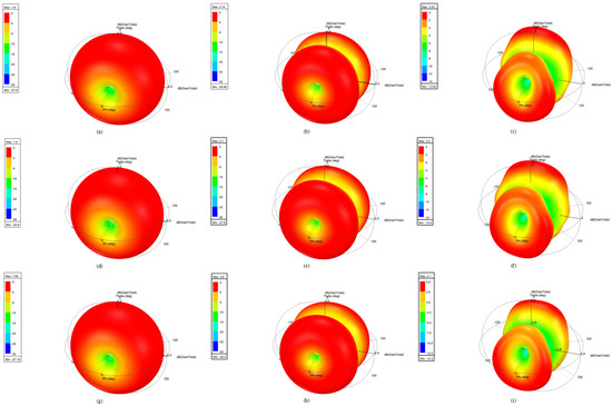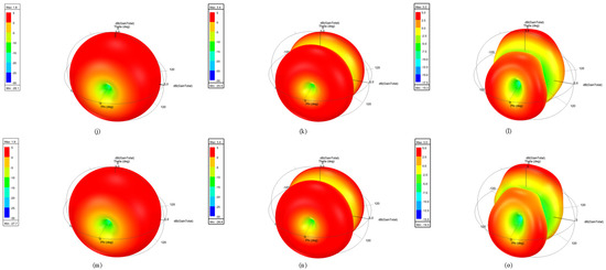 Simulated results from the obtained structure of the tri-band antenna of HFSS: (a) 3D polar plot of antenna model x (1) at 2.17 GHz; (b) 3D polar plot of antenna model x (1) at 5.28 GHz; (c) 3D polar plot of antenna model x (1) at 7.45 GHz; (d) 3D polar plot of antenna model x (2) at 2.17 GHz; (e) 3D polar plot of antenna model x (2) at 5.28 GHz; (f) 3D polar plot of antenna model x (2) at 7.45 GHz; (g) 3D polar plot of antenna model x (3) at 2.17 GHz; (h) 3D polar plot of antenna model x (3) at 5.28 GHz; (i) 3D polar plot of antenna model x (3) at 7.45 GHz; (j) 3D polar plot of antenna model x (4) at 2.17 GHz; (k) 3D polar plot of antenna model x (4) at 5.28 GHz; (l) 3D polar plot of antenna model x (4) at 7.45 GHz; (m) 3D polar plot of antenna model x (5) at 2.17 GHz; (n) 3D polar plot of antenna model x (5) at 5.28 GHz; (o) 3D polar plot of antenna model x (5) at 7.45 GHz.