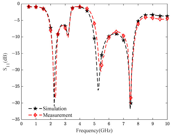 Finally, we have fabricated the antenna model x (1) in Table 5 and measured the reflection coefficient of the antenna. The real antenna is shown in Figure 14, and the measured results of the reflection coefficient are shown in Figure 15. It is easy to see from Figure 15 that the measured and simulated results of the antenna are very similar. The reflection coefficient is less than −10 dB in the three frequency bands, and the measured results conform to the expected objective. This further illustrates the effectiveness and practicality of the method proposed in this paper. From all the results above, it is demonstrated that the proposed method has high prediction accuracy, dramatically improves the time-consuming aspect, and can quickly design the antenna to meet the requirements.
