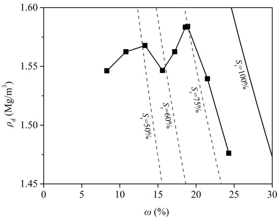 The GRS used in this study is obtained from Shenzhen, Guangdong Province, China. The bulk GRS is air-dried and pulverized carefully using a rubber hammer to avoid breakage of the sand particles. The grain size distribution (GSD) of the air-dried GRS is measured by dry-sieving (after washing) in combination with the Hydrometer method [27]. The overall GSD curve of the GRS is shown in Figure 1; it is observed to be a gap-graded soil dominated by 40% fine particles (d < 0.075 mm) and 25% coarse particles (d > 2 mm) on a dry-weight basis. Sand particles coarser than 5 mm account for no more than 1%; for convenience, they are eliminated from the original soil in the following test procedures. The specific gravity of the fractions finer than 5 mm is measured using the Pycnometric method [28]. The consistency limits of the fractions finer than 0.5 mm are determined using a liquid-plastic limit combined tester [29]. A bimodal compaction curve is revealed by the standard Proctor test [30] (see Figure 2); this may be due to the GRS’s gap-graded nature. The optimum water content and maximum dry density are identified at the second peak of the compaction curve. The basic physical properties of the GRS are summarized in Table 1. According to the Unified Soil Classification System [31], the GRS is classified as silty sand.