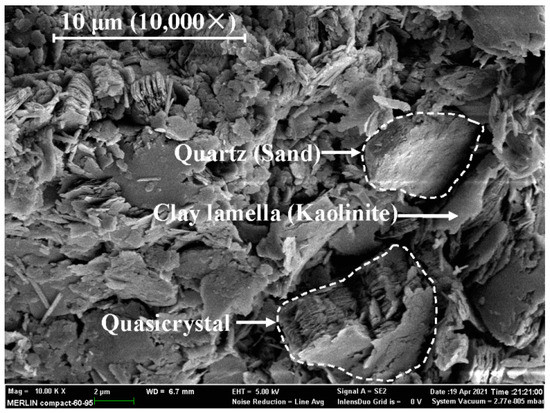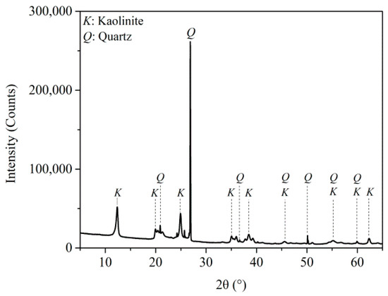 The XRD profile of the GRS with a grain size finer than 0.5 mm is shown in Figure 3, and the basic minerals are identified as Kaolinite (90%) and Quartz (10%) on a dry-weight basis. A SEM image of the GRS with a grain size finer than 0.5 mm is shown in Figure 4. The clay lamella of Kaolinite and its stacks (i.e., quasicrystal) are vivid in the SEM image, and the irregular quartz is wrapped in the clay lamellae. Despite the high clay content, clay aggregates (i.e., stacks of quasicrystals) are not recognized from SEM image, indicating a single-porosity structure of GRS compared to the dual-porosity structure of clays [32,33].