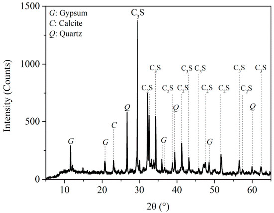 The Portland fly-ash cement used in this study is of a commercial type (PF32.5 [34]) containing 25% of active fly-ash on a dry-weight basis; this cement type is preferred in the context of embankment construction due to its economy and low hydration heat. The grain-size distribution of the powder cement is obtained by laser particle-size analysis with dry dispersion and the result is added to Figure 1. The specific gravity of the powder cement is estimated to be 3.10 via the Pycnometric method [28] with Kerosene (instead of water) used as the dispersion medium. The XRD profile of the oven-dried powder cement is shown in Figure 5, and the basic mineral compositions are identified as Tricalcium silicate (C3S, 71%), Quartz (12%), Gypsum (8%), Calcite (6%), and Dicalcium silicate (C2S, 2%) on a dry-weight basis. The XRD results do not reveal the presence of Tricalcium aluminate (C3A) and Tetra-calcium aluminoferrite (C4AF), possibly because of their low fractions.