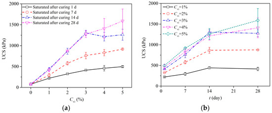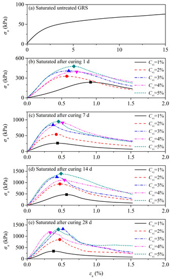 One set of the uniaxial compression curves of the saturated untreated and cement-treated GRSs is shown in Figure 6. For the untreated specimen, the stress–strain relationship is of strain-hardening type (see Figure 6a). In this case, the axial stress at an axial strain of 15% is adopted as the UCS of the specimen. For the treated specimens cured to 1–28 d, the stress–strain relationship is of strain-softening type (see Figure 6b–e). In this case, the UCS of the specimen is identified at the peak state. The relationship between the UCS and the cement content at four curing times is shown in Figure 7a. As the volumetric cement content increased from 0% to 3%, UCS increased linearly from 78 kPa to 413 kPa, 763 kPa, 1306 kPa, and 1277 kPa at curing times of 1 d, 7 d, 14 d, and 28 d, respectively. As the volumetric cement content exceeded 3%, the increase of the UCS with the cement content diminished. The relationship between the UCS and the curing time at five cement contents is shown in Figure 7b. For a given cement content, UCS increased linearly in the first 14 d and the increase of UCS with the curing time was then diminished (most notably in the case of Cvi = 1–3%). In detail, the UCS of the specimens cured to 1 d, 7 d, and 14 d reached 31–53%, 59–71%, and 79–107%, respectively, of those cured to 28 d, and these ratios decreased as the cement content increased. In the case of Cvi ≥ 4%, the UCS developed successively within 28 d; in the case of Cvi ≤ 3%, the development of the UCS ended at an early age of 14 d.