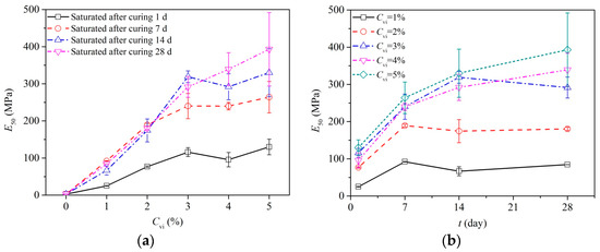 In all the cases, the uniaxial compression curves are nonlinear before the peak state (see Figure 6). In this study, the secant modulus is determined to describe the stiffness of the specimen. The dependence of the secant modulus on the cement content and curing time is shown in Figure 8. The experimental trends are similar to that of the UCS. As the volumetric cement content increased from 0% to 3%, the secant modulus increased almost linearly from 2.8 MPa to 116 MPa, 240 MPa, 319 MPa, and 292 MPa at a curing time of 1 d, 7 d, 14 d, and 28 d, respectively (see Figure 8a). As the volumetric cement content exceeded 3%, the increase of the secant modulus with the cement content diminished. For a given cement content, the secant modulus of the specimens increased rapidly in the first 7–14 days, after which the increase of the secant modulus with the curing time diminished (see Figure 8b). Specifically, the secant modulus of the specimen cured to 1 d, 7 d, and 14 d reached 28–43%, 67–109%, and 84–109%, respectively, of those cured to 28 d. A similar conclusion can be drawn that the secant modulus of the specimens developed successively in 28 d in the case of Cvi ≥ 4% and may have ended in 7–14 d in the case of Cvi ≤ 3%.