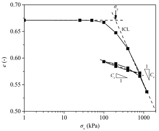 Oedometric compression curves of the saturated untreated and cement-treated GRSs cured to 7 d and 28 d are shown in Figure 9 and Figure 10, respectively. The e−logσv relationship is nonlinear in all the cases, indicating initial over-consolidation states of the specimens due to compaction. The untreated specimen entered the normal consolidation state as the vertical pressure exceeded 400 kPa (see Figure 9). However, the states of the treated specimen cannot be confirmed due to the moderate stress level (see Figure 10). Nevertheless, the compression index (Cc) of the specimens was determined via linear fitting of the e−logσv relationship in the range of σv > 400 kPa (for Cvi = 0–4%) or σv > 800 kPa (for Cvi = 5%). The unloading–reloading cycle yielded a hysteresis loop of the e−logσv relationship; its diagonal slope (absolute value) was accepted as the rebound index (Cr) of the specimen. Given the subjectivity of Casagrande method [36], an alternate approach was employed to determine the vertical yielding pressure (σy) of the specimen [37]. As all the compression curves are horizontal in the case of σv < 12.5–25 kPa, the vertical pressure at which the intrinsic compression line (ICL) intersects the initial void ratio was deemed to be the vertical yielding pressure of the specimen (see Figure 9 and Figure 10).