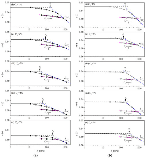 Integrated plot of the e−logσv relationship of saturated untreated and cement-treated GRSs. (a) Curing time = 7 d; (b) Curing time = 28 d.
