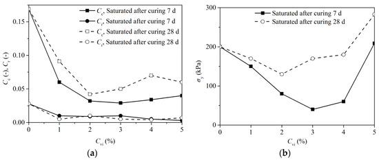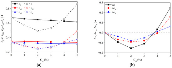 The macro- and micro-void ratios and (total) void ratios of the as-compacted and saturated specimens cured to 28 d are presented in Figure 22a. In the case of Cvi ≤ 2%, the macro- and micro-void ratios decreased successively as the cement content increased; this may be because the occupation of the macro- and micro-pores by the C–S–H (i.e., the second mechanism) surpassed the formation of the micro-pores within the C–S–H (i.e., the first mechanism) and the emergence of the aggregates (i.e., the third mechanism) is invalid in this case (as was revealed in Figure 13b,c). As the volumetric cement content increased from 2% to 4%, aggregates gradually formed (see Figure 13d,e), and the macro- and micro-void ratios started to increase; as long as the second mechanism dominated, the macro- and micro-void ratios would be lower than their initial values. As the volumetric cement content exceeded 4%, the dual-porosity characteristic of the cured specimens became remarkable (see Figure 13f). In this case, the third mechanism is believed to dominate and the macro- and micro-void ratios of the cured specimens exceed their initial values.