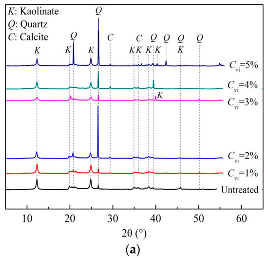 Cementitious products include the C–(A)–S–H and CH (calcium hydroxide). The C–A–S–H and C–A–H are unidentifiable due to the negligible C3A in the cement used in this study. XRD patterns of the saturated untreated and cement-treated GRSs cured to 28 d are shown in Figure 12. The crystalline minerals include the Kaolinite and Quartz from the original soil and the non-hydratable Calcite from the cement (see Figure 12a). For the treated specimens cured to 28 d, C–S–H was identified at 2θ = 29.0°, 29.2°, 29.5°, and 32.1° (see Figure 12b) [38,39,40].