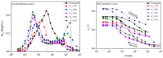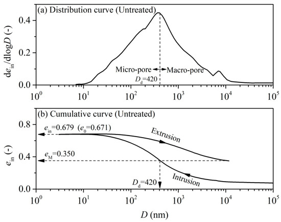 The cumulative curves came from the cumulated intrusion volume of the mercury in an intrusion–extrusion cycle multiplied by the equivalent grain density (i.e., ein = Vin × ρs) (see Figure 14b). It was assumed that the mercury was retained in the macro-pores after the intrusion pressure was removed [32,33]. Therefore, the macro-void ratio (ratio of the volume of macro-pores to the volume of all solid particles, eM) equals the intruded void ratio after an intrusion–extrusion cycle. In addition, the maximum ein was identified and adopted as the intruded void ratio of the specimen (ein). The micro-void ratio (ratio of the volume of micro-pores to the volume of all solid particles, em) is the difference between the void ratio (e) of the specimen and the macro-void ratio (i.e., em = e − eM). As the void ratio of the specimen may change during curing, the exact micro-void ratio cannot be determined based on the initial void ratio (e0). Figure 15 illustrates the delimitation of the macro- and micro-pores for the saturated untreated specimens as an example. The ein and eM of the specimens were determined based on this criterion, and the dependences of e0, ein, and eM on the cement content are shown in Figure 16. The ein and eM were observed to decrease with the cement content in the range of Cvi ≤ 2%, and these tendencies reversed as the cement content further increased. For the untreated specimen, the ein equals the e0, indicating no changes in the void ratio during confined wetting; this allows the eM and em of the untreated specimen to be determined (giving eM = 0.35 and em = 0.33). For the treated specimens, the differences between the ein and e0 are the combined effects of the formation of C–S–H and aggregates. The detailed mechanisms are discussed and the void ratios of the cured specimens are estimated in Section 4.3.