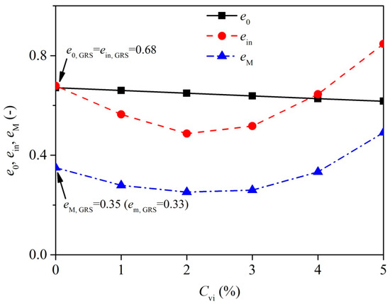 Moreover, the GRS components in all the as-compacted specimens were scheduled to an identical dry density of 1.58 Mg/m3 (which gives e0,GRS = 0.67); therefore, the following correlations can be established according to Figure 21: