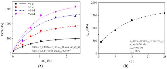 The UCS(η = 0.4, Cvi = 0) was fixed at 78 kPa for the untreated specimen based on the test results and a direct fitting of the four data sets gave βUCS = (8.7 ± 0.5) × 10−3. Given its small variation, βUCS was fixed at 8.7 × 10−3, independent of the curing time. The adjusted fitting is presented in Figure 17a, and the dependence of αUCS on the curing time is shown in Figure 17b. The αUCS also presents a diminished increase with the curing time and an exponential function can be formulated:
