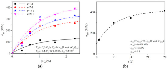 where αE50(t = 0) is the αE50 for the non-cured specimen. The λE50t and γE50t describe the diminished increase of αE50 with the curing time. The αE50(t = 0), λE50t, and γE50t were fitted to be 101 MPa, 316 MPa, and 8.0 d, respectively (see Figure 18b).