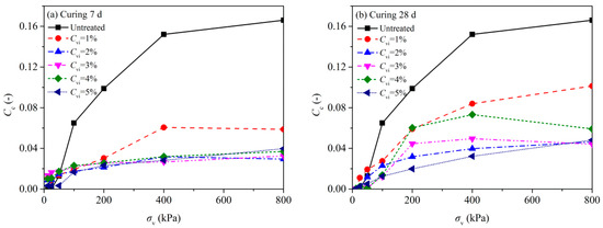 Compression index of saturated untreated and cement-treated GRSs depending on vertical pressure. (a) Curing time = 7 d; (b) Curing time = 28 d.
