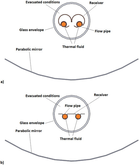 Two PTCs were studied in the present work, one with a twin cavity receiver (PTC-TC) and one with a flat plate absorber (PTC-F). Both receivers were enclosed inside evacuated tubes for ensuring the minimization of thermal losses. The design of the collectors is given in Figure 1. This Figure depicts the geometry of the two examined PTCs. It is important to mention that there is a specific position between the receiver and the reflector in each case. In particular, the receiver with the twin cavities is in a position where the reflector’s focal distance is on the centerline axis of it, and all the reflected solar rays end up at the interior of the two cavities. The specific geometry was revealed through an optimization that took place via a ray tracing process in order to ensure the optimum useful power. This optimization is described in the next stages of the manuscript. The positioning in the PTC-F is simpler than in the PTC-TC, since the focal point here is located in the middle of the receiver between the twin tubes. All the models’ dimensions are given in Table 1.