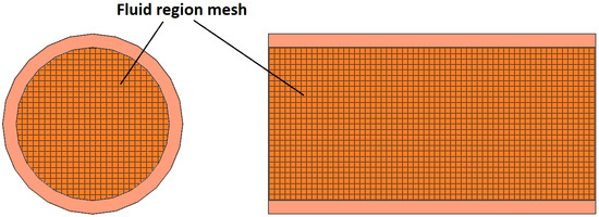 An important step in the development of the simulation models is the mesh independence procedure. Thus, 8 different meshes were examined for every model, aiming to determine the most suitable one which leads (i) to accurate results and (ii) to a reasonable computational time. The two main criteria were applied for choosing the most suitable mesh for each model, and they were the convergence of the thermal efficiency and of the receiver temperature. Table 3 presents the sensitivity analysis of the mesh independence analysis. The finally selected mesh size had 1.62 × 106 elements in the PTC-TC case and 1.94 × 106 elements in the PTC-F model. The fluid region was covered by 31% and 26% of the total elements in the PTC-TC and PTC-F, respectively. The mesh was also refined properly on the absorbing surfaces and the solid-to-fluid interfaces. Figure 3 gives the mesh illustration of the interior of the tube in order to present a clear view of the mesh structure. It is important to mention that the fluid mesh was identical in both cases, since the number of fluid cells was 0.5 × 106 in both models.