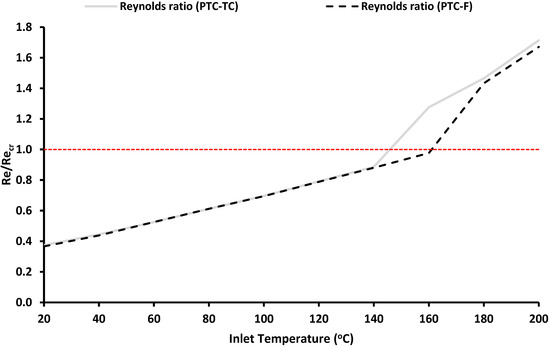 Reynolds ratio for both PTCs (the horizontal dotted red line indicates the transition limit).