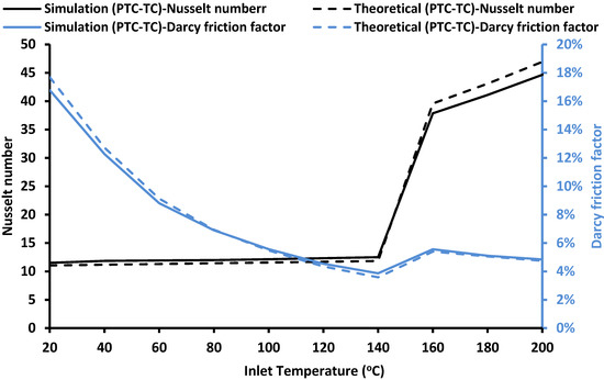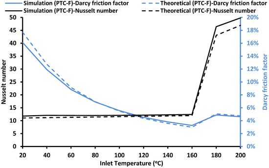 As is depicted in Figure 4, the transition to the turbulent state was different for each PTC. More specifically, the transition happened from 140 °C to 160 °C in the PTC-TC and in the range of 160 °C to 180 °C in the PTC-F. This difference existed due to the higher temperature levels of the PTC-TC against the PTC-F. Hence, the theoretical models were applied for the whole operating temperature range by also taking into consideration the transition regions, which came from Figure 4. Figure 5 presents the verification results concerning the Nusselt number and the Darcy friction factor for the PTC-TC. The respective results for the PTC-F are given in Figure 6.