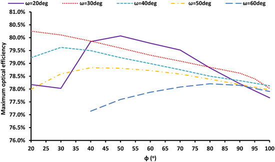 This subsection refers to the results coming from the optical optimization of the PTC-TC as far as the geometry of the cavities is concerned. The optimization was based on three different parameters (ω, φ, and q), while several different combinations were examined for achieving the desired result. The optimization results are presented in Figure 7. More specifically, the specific chart depicts five different efficiency curves, each one of which corresponds to a specific (ω) value as a function of the (φ) parameter. These curves were plotted considering the (q) values that ensure the maximum optical performance in each case.