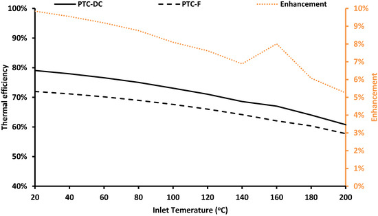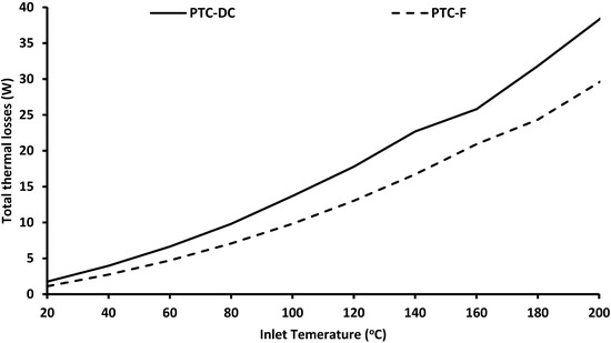 This section is dedicated to the results concerning the thermal investigation of the studied collectors. The thermal efficiency and the total thermal losses are presented in Figure 8 and Figure 9, respectively, for the whole operating range (20 °C–200 °C) of this study. Figure 8 comes to prove the superiority of the PTC-TC against the PTC-F in thermal efficiency. More particularly, the mean enhancement gained from the use of the cavity configuration reached 8%, which is a remarkable percentage for this kind of application. The specific enhancement ranged from 5.25% up to 9.85%, achieving its lower values in high operating temperatures due to the increase of heat losses. According to Figure 9, thermal losses seemed to take reasonably higher values in the PTC-TC geometry, since the receiver surface in the latter was much greater than in the PTC-F.