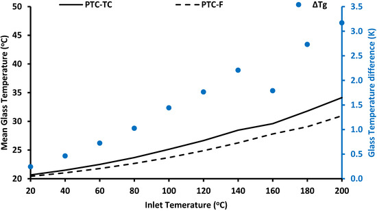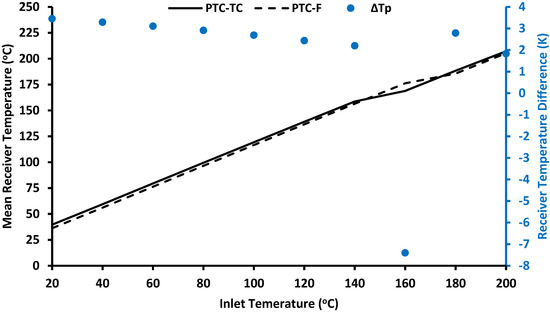 In Figure 10 and Figure 11, the mean values of the receiver and the glass temperature are presented for the whole operating range. As Figure 10 shows, the receiver temperature seemed to be greater in the PTC-TC case for almost the whole operating range. This is reasonable considering that the receiver of the PTC-TC absorbed 10.14% more solar irradiation than the PTC-F receiver. It is interesting to comment that for the inlet temperature of around 160 °C, the temperature of the receiver for the PTC-F was about 7 K higher compared to the PTC-TC case. This result happened due to the earlier transition of the PTC-TC to the turbulent state compared to the PTC-F. According to Figure 11, the glass temperature level was higher in the PTC-TC, which is a reasonable result because the receiver absorbed more solar power and it also had a greater size than that of the PTC-F geometry.