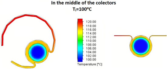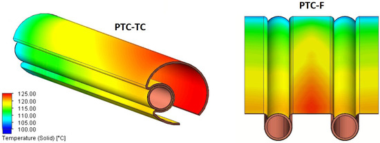 Figure 12 illustrates the receiver temperature allocation for the operating point of Ti = 100 °C for each PTC. As Figure 12 shows, the receiver temperature fields were higher in the PTC-TC scenario than expected, since in this case, the solar absorption was greater. It is also critical to say that the temperature in both receivers had, reasonably, higher values in the region where the solar irradiation was concentrated in every case. This proves that the ray tracing simulation is very close to the real ray tracing procedure.