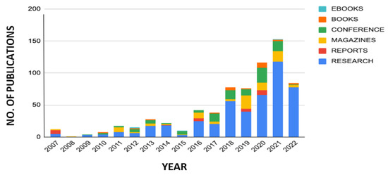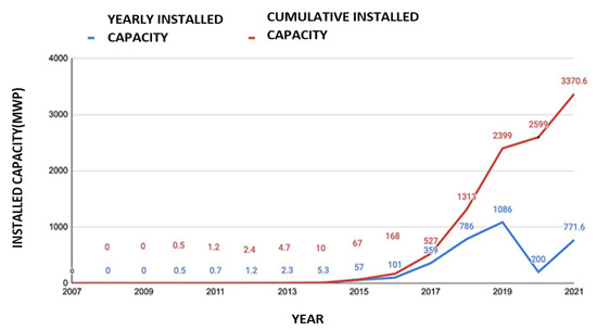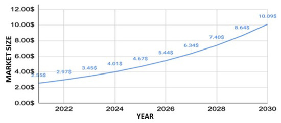 In recent years, a particular technology has been developed which involves fixing PV systems on canals, conduits, and channels. This technology is popularly called the floating solar PV system (FSPVS). The first proper FSPVS system was installed in 2007 in Aichi, Japan. It slowly began to increase with the yearly installed capacity reaching up to 1096 MWp per year. By the end of August 2020, the total global installed capacity of FSPVS would have reached 2.6 GWp. However, owing to COVID-19, installations were expected to decelerate in 2020, as seen in Figure 1 [5,6,7,8]. According to the report presented in [9], the worldwide floating solar market was valued at USD 2.55 billion in 2021 and is predicted to increase to USD 10.09 billion by 2030, with a compound annual growth rate (CAGR) of 16.5% between 2022 and 2030. This can be easily inferred from Figure 2. The number of research papers on floating PV systems in the last 15 years is shown in Figure 3. It is clear that FSPVS is an exponentially growing technology.