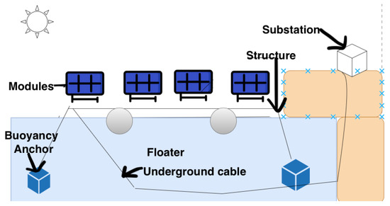 - PV system: A PV system consists of PV modules and other power conditioning equipment for converting solar energy to electrical energy. In general, crystalline solar PV modules are utilized, although there is ongoing research into the type of PV modules installed in FSPVS. Sahu et al. [10] recently conducted an energy analysis of thin-film PV technology on land, water, and submerged systems, demonstrating the advantages of submerged installations.