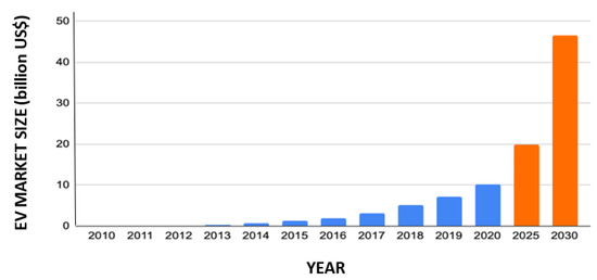 EV market size (in billion USD) from 2010–2020 and projected market size till 2030.