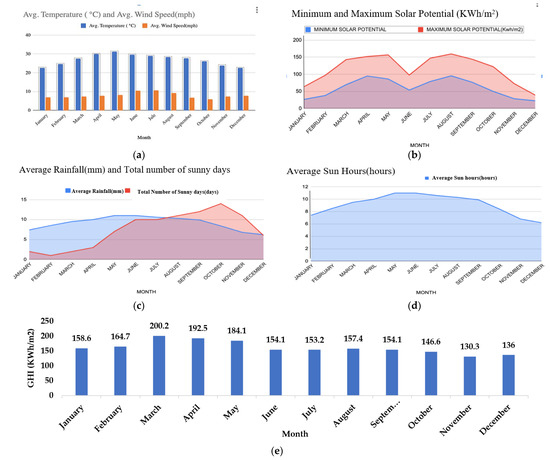 Monthly variation of various climatic parameters: (a) average temperature and wind speed; (b) minimum and maximum solar potential; (c) average rainfall and total number of sunny days; (d) average sun hours at Vellore; and (e) GHI irradiance per day by month.
