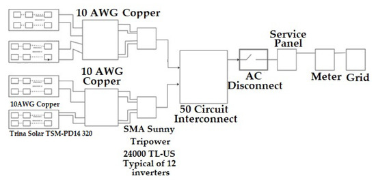 4688 PV modules of Trina Solar TSM-PD14 3209 (May 15) [24] were chosen for installation. The STC Rating of the module was 320 W. The PV modules were connected to copper switches which were in turn connected to 50 nos. of SMA Sunny Tripower 24,000TL-US inverter [25]. The maximum input voltage of the inverter was 1000 V. The AWG Copper wires [26] were of string type and were 52,660 ft long. The component specifications are tabulated in Table 1.