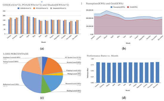 (a) GHI, POA and shaded radiation; (b) nameplate energy and grid energy; (c) loss % age; and (d) performance ratio.