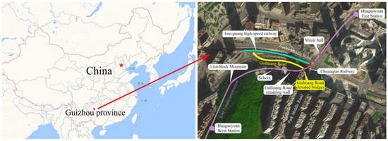 In Guiyang City, Guizhou Province, the Rail Transit Line 3 phase 1 project takes the following route from Huaguoyuan West Station to Huaguoyuan East Station: the interval tunnel out of Huaguoyuan West Station through the lion rock mountain, undercrossing the school, Guihuang elevated bridge, Chuanqian Railway roadbed, sidecrossing the Guiguang High-speed Railway bridge pile, undercrossing the Zunyi Middle Road antislip pile and concert hall, and finally arriving at Huaguoyuan East Station. The interval mileage of the piled section under the Guihuang Viaduct is YDK29+255~YDK29+290, ZDK29+280~ZDK29+315. The geographical location of the pile foundation underpinning is shown in Figure 1.