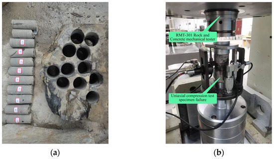 To determine the deformation modulus of the rock formation, we conducted an indoor rock test, as shown in Figure 3. The uniaxial compressive strength of the rock was measured to be 37.909 MPa, while the rock integrity index provided by the geological survey report was 0.44 and the rock wave speed was 3.42 km/s. In this paper, research results from the literature [27] are used to determine the deformation modulus of the rock mass, which is calculated by Equation (1).