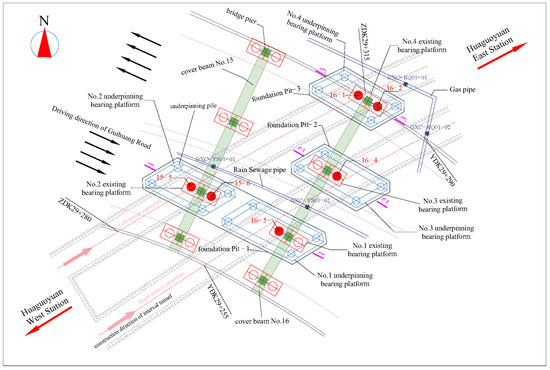 As Guiyang Rail Transit Line 3 crosses the bridge piles of Guihuang elevated bridge, some of the original bridge piles are truncated by the tunnel. In order to ensure the structural and operational safety of the Guihuang Viaduct, the pile foundations of piers 15 and 16 of the Guihuang Viaduct need to be underpinned. The construction solution is to use passive underpinning. The plan for the underpinned pile foundation is shown in Figure 4. A total of six bridge piles within the upstream and downstream lanes need to be underpinned; the piles to be underpinned are 15-5, 15-6, 16-1, 16-2, 16-4, and 16-5 of the Guihuang Viaduct, and the diameter of the pile to be replaced is 1.8 m, which is cast with C30 steel concrete. The diameter of the underpinning pile is 1.5 m, with a total of 16 piles. There are four underpinned bearing platforms, and both the underpinned bearing platform and underpinning pile are cast with C35 reinforced concrete. A total of three foundation pits are excavated, to an excavation depth of 5.4 m, from Huaguoyuan West Station to Huaguoyuan East Station in the direction of construction. The relationship between stratigraphy and pile foundation location and the profiles of the underpinning pile foundations 1-1, 2-2, and 3-3 are shown in Figure 5 (unit: cm).