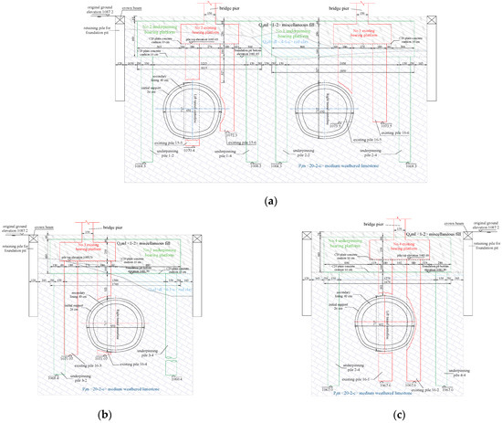 The interdistrict tunnel at the pile foundation underpinning belongs to a mound and valley landform of the dissolution type. According to the engineering geologic investigation report, the main strata at the pile foundation underpinning are miscellaneous fill, plastic red clay, and medium-weathered limestone. The uppermost layer is <1–2> miscellaneous fill (Q4ml), mainly composed of construction waste and artificial backfilled gravel, etc. The gravel blocks are mainly dolomite, the voids are filled by clayey soil, and the structure is looser. The middle layer is <4–1–3> plastic red clay (Q4el+dl); the soil is brownish-yellow, maroon, etc., and is locally distributed in the stratum, with engineering properties such as softening in water, fissure development, and easy flaking. The lower layer is <20–2–3> medium-weathered limestone (P1m), with a greenish gray, gray-black, medium-layered structure. The rock is relatively complete, and the mineral composition is mainly composed of calcite and biological debris.