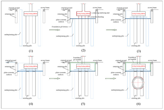 The construction process of the underpinned pile foundation is divided into a total of six construction stages, with the following construction steps: (1) underpinned pile and retaining pile for foundation pit construction; (2) the excavation of the foundation pit, pouring a 10 cm C20 concrete bedding layer at the bottom of the foundation pit, and welding connection steel on the side of the existing pile cap; (3) the underpinning pile cap is cast with C40 concrete; (4) in the underpinned bearing platform bottom, the local excavation of a 0.3 m~0.5 m deep trench, the wire saw cutting of the existing pile into a working surface, using the mechanical vibrationless linear cutting process to cut the existing pile, and backfilling the trench at the bottom of the platform with mortar; (5) backfilling the foundation pit to the original ground level, restoring the surrounding ground and road surface; and (6) tunnel construction, breaking up the existing pile foundation when encountered. These steps are shown in Figure 6.