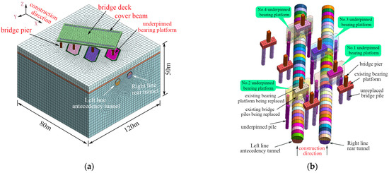 In this paper, the effects of underpinned pile foundation and tunnel construction on the existing elevated bridge were simulated using the 3D finite element analysis software Midas GTS. In order to simplify the model and weaken the influence of tunnel boundary effects on the simulation results, the dimensions of the model strata were calculated using 3 to 5 times the tunnel excavation diameter: longitudinal (80 m) × transverse (80 m) × vertical (50 m). The mesh used in this numerical model consists of 57,555 nodes and 94,142 elements. For the accuracy of calculation, the grid size of the tunnel excavation, pile foundation, and bearing platform area is divided by local encryption. Fixed constraints are added to limit the displacement of the model in the horizontal and bottom directions, while the upper part of the model has a free boundary without the addition of constraints. The lane loads were applied to the bridge deck, the same as they were to the uniform and concentrated loads, while RZ directional restraints were added to all pile foundations to limit their rigid body rotation displacement. The spatial dimensions of the computational model are shown in Figure 7a, and the internal schematic of the computational model is shown in Figure 7b.