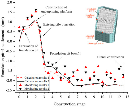 The settlement curve of the underground diaphragm wall with the construction process of pile foundation underpinning is shown in Figure 8 (this paper only takes foundation pit 1 as an example). From the figure, we can see that with the excavation of foundation pit 1, the underground diaphragm wall produces uplift, and the maximum amount of uplift is 1.2 mm. Underpinning bearing platform construction, existing pile truncation construction, foundation pit backfill, and other stages will cause the settlement of the diaphragm wall, with a maximum settlement amount of 2.2 mm. The settlement of the diaphragm wall slowly stabilized when the tunneling was carried out after the completion of the underpinning system.